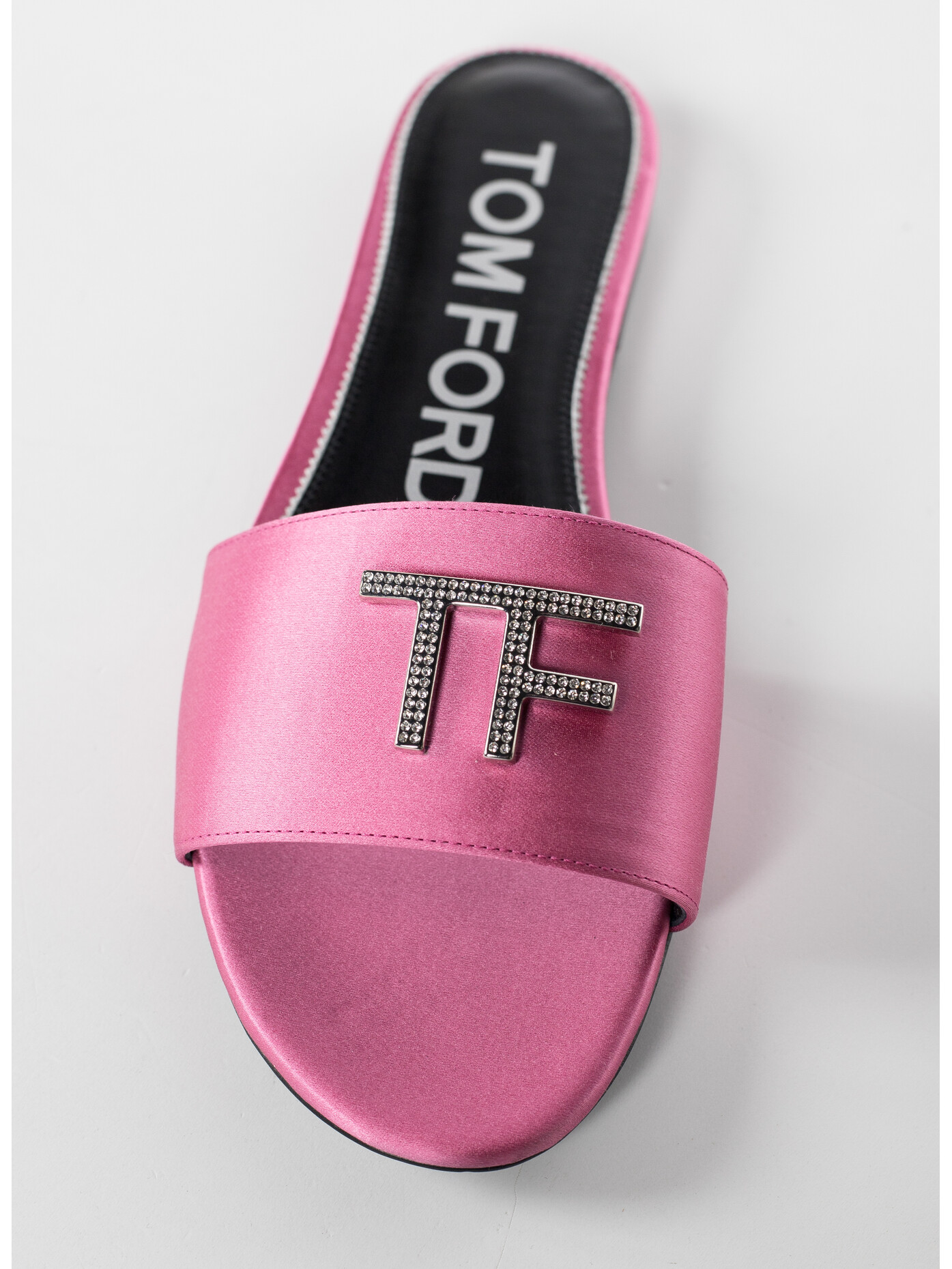 Mantieni il tuo look comodo e chic con queste eleganti ciabatte in raso di Tom Ford. Realizzate in raso, presentano un'applicazione TF ricoperta di cristalli e un tacco basso.
