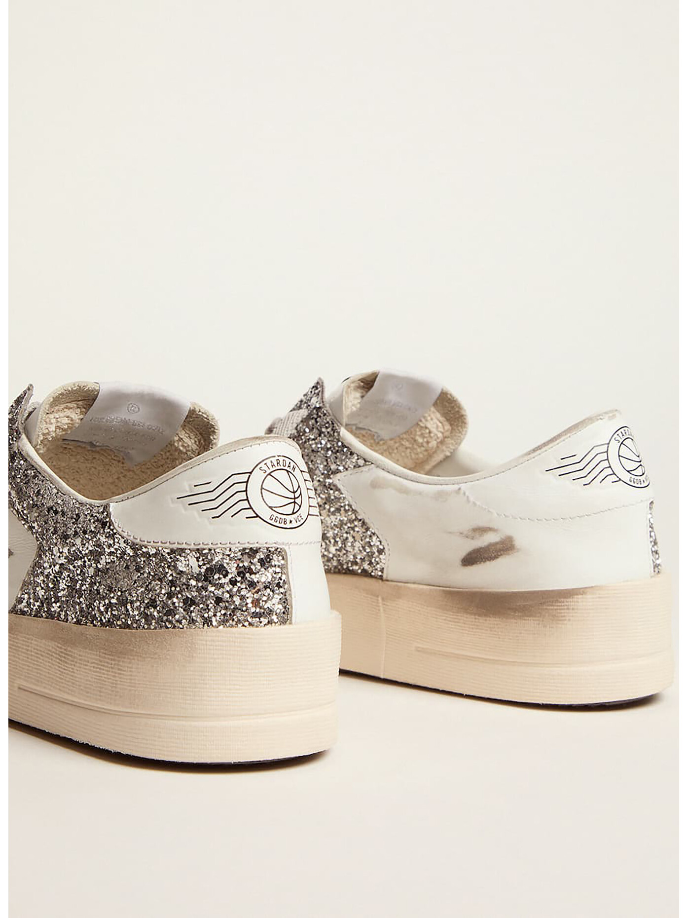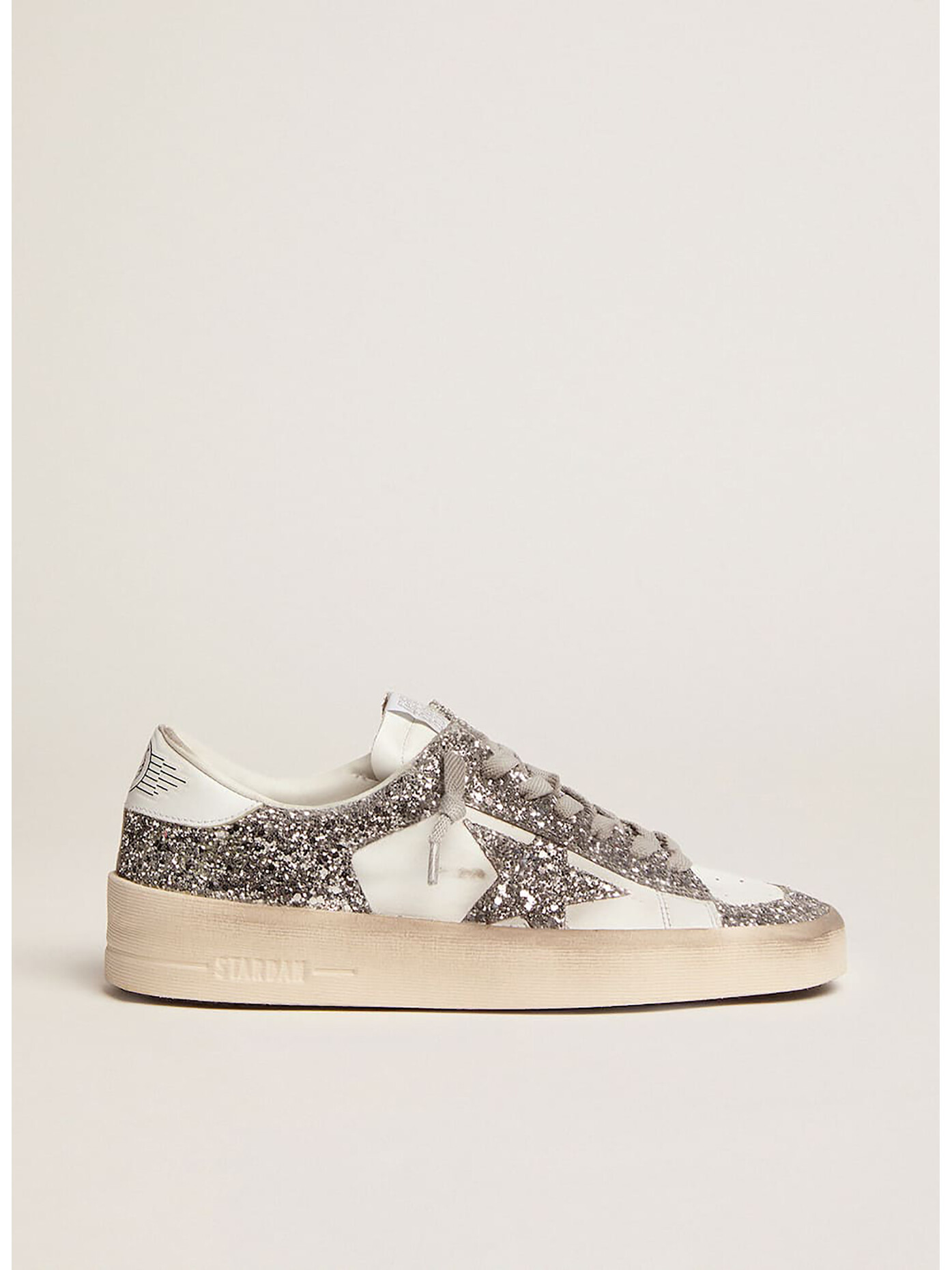 La tomaia in pelle bianca si illumina con scintillanti dettagli in glitter, mentre la stella e il talloncino, impreziositi da glitter, aggiungono una brillantezza che non può passare inosservata.